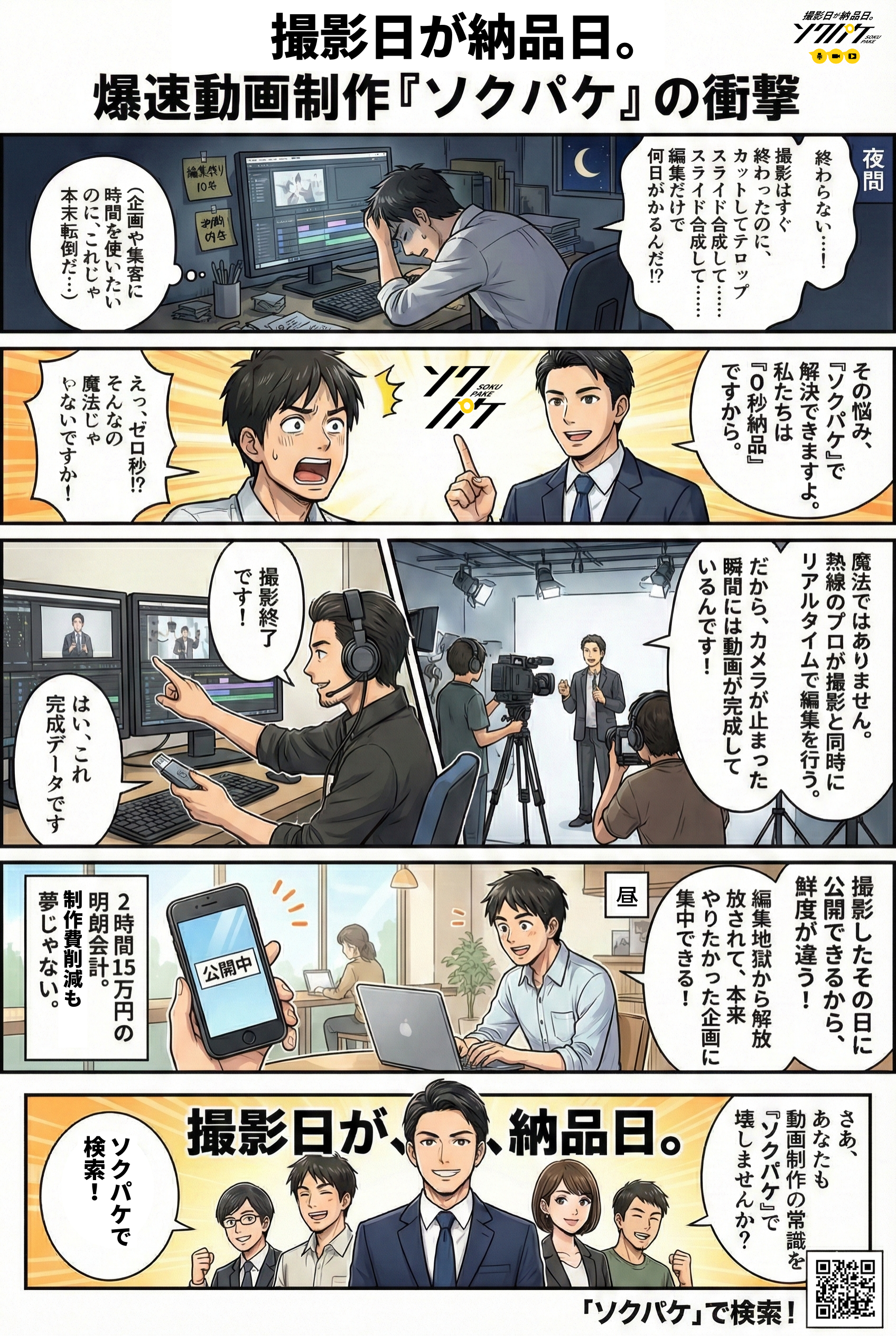 【マンガでわかりやすく!】爆速動画制作「ソクパケ」の衝撃!撮影日が納品日!?魔法のような映像制作編